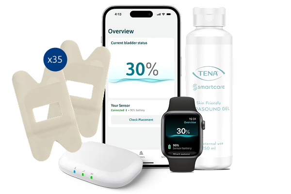 De TENA SmartCare Bladder Sensor is een klein, niet-invasief apparaat dat via ultrasone technologie bijhoudt hoe vol de blaas is en je kind laat weten wanneer het tijd is om te gaan.
