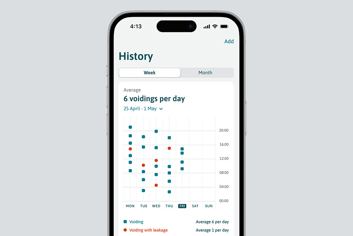 De TENA SmartCare Bladder Sensor detecteert hoe vol de blaas van uw kind is door middel van echografie. Gebruik de app om het blaaspatroon te volgen met het plasdagboek.