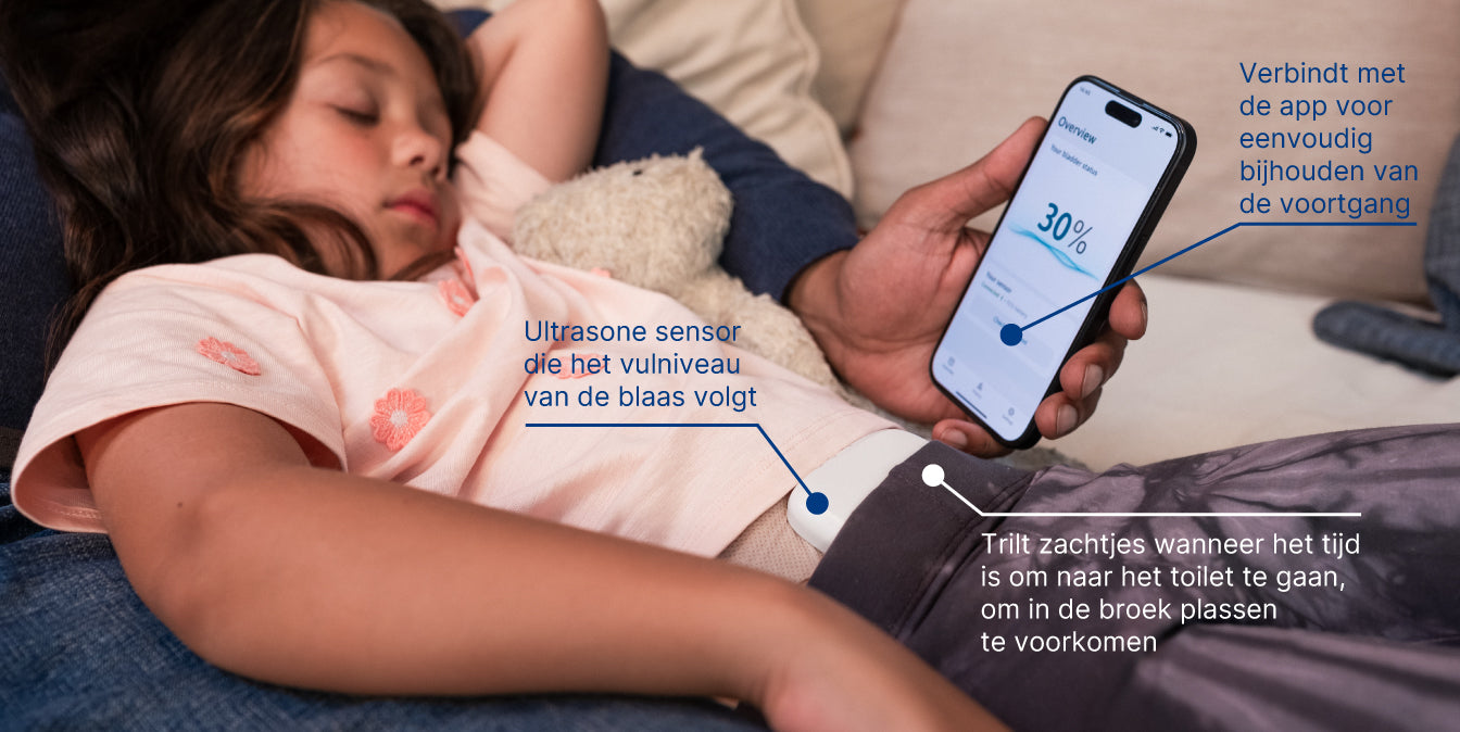 De blaascapaciteit is gebaseerd op het maximale blaasvolume. Je kunt het maximale blaasvolume van je kind bepalen door: 1) Het ochtendvolume te meten (laten plassen in een opvangbeker), of 2) Een blaasscan te laten uitvoeren door een zorgprofessional.Als deze opties niet wenselijk zijn, kun je beginnen met de laagste capaciteit om te beoordelen of het aantal meldingen van de sensor logisch lijkt.Als je kind te veel meldingen krijgt dat de blaas vol is, kan de capaciteit worden verhoogd. Als de meldingen te laat komen, kan de capaciteit worden verlaagd. Het kan een paar dagen duren om de juiste instelling voor je kind te vinden. De blaascapaciteit kan op elk moment eenvoudig worden aangepast in de instellingen van de app.
